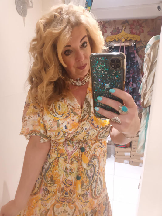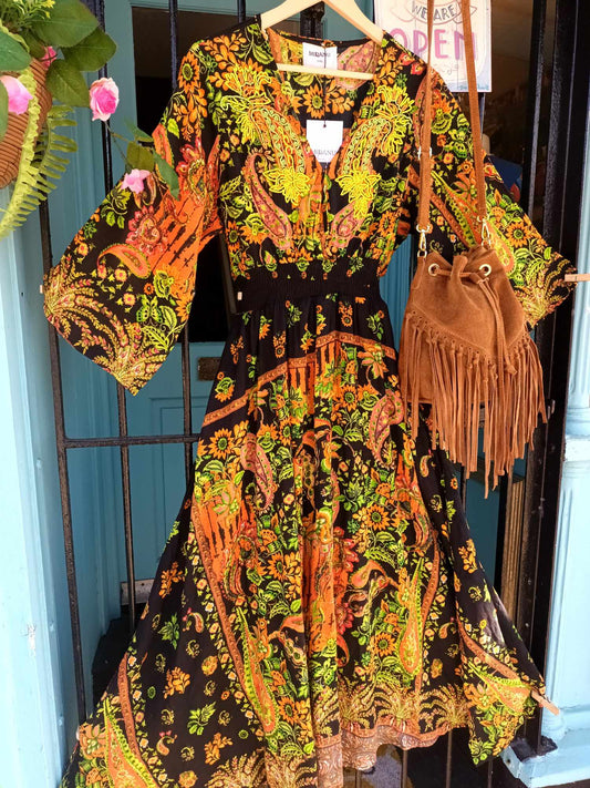 THE 'STEVIE' BREATHTAKING INDIAN COTTON BOHEMIAN PRINT FULL SKIRTED DRESS WITH LOVE BEAD EMBELLISHMENTS