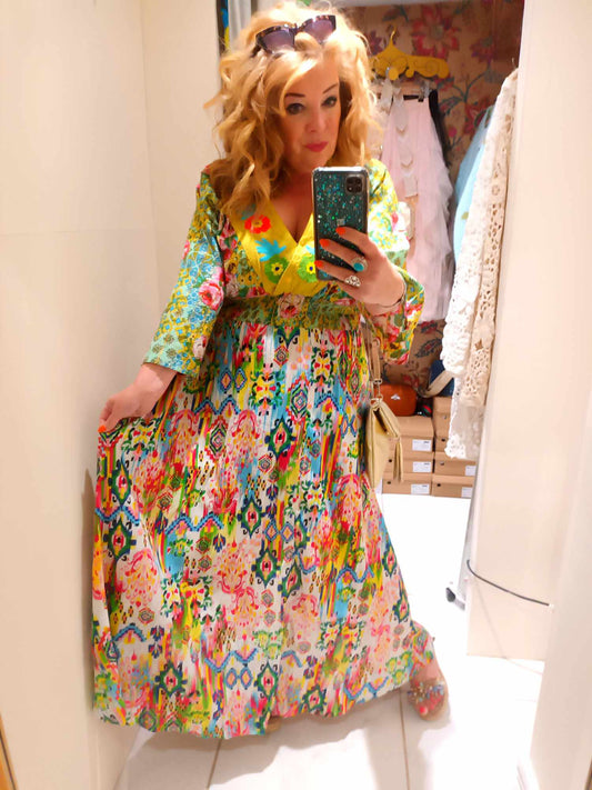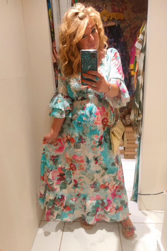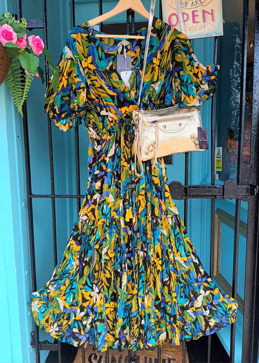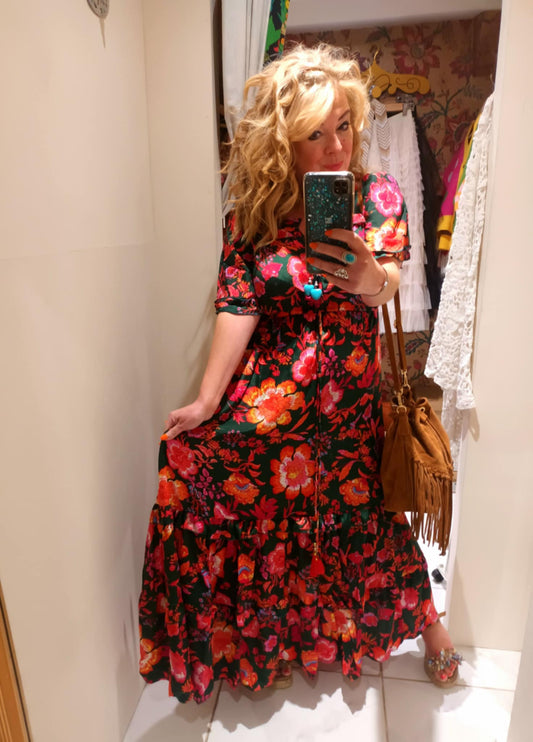THE 'ALHAMBRA SUNSET' BREATHTAKING VIBRANT BOTANICAL PRINT FRILL HEM DRESS FROM OUR EXCLUSIVE SPANISH COLLECTION