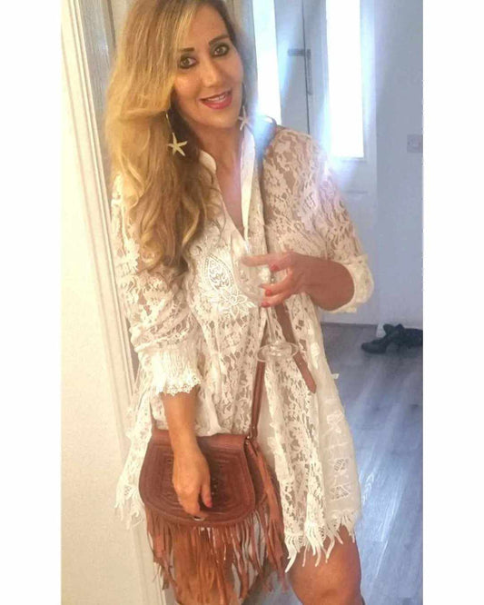 THE 'CHANTELLE' BEAUTIFUL WHITE LACE BEADED FLIPPY GODET HEM BOHEMIAN STYLETUNIC DRESS