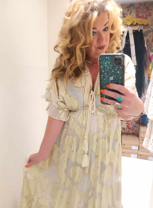 THE 'CELENE' BEAUTIFUL TASSEL DETAIL FLOATY CHIFFON BEAD EMBELLISHED DRESS IN VANILLA AND GOLD