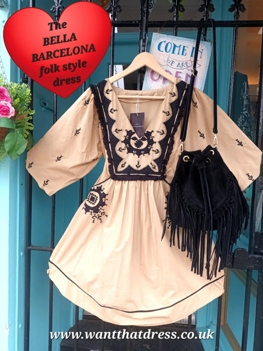 THE 'BELLA BARCELONA' BEAUTIFUL FOLK STYLE POCKET FRONT DRESS WITH STUNNING FRINGE AND EMBROIDERED DETAIL