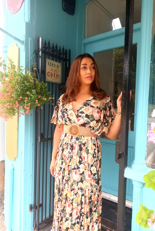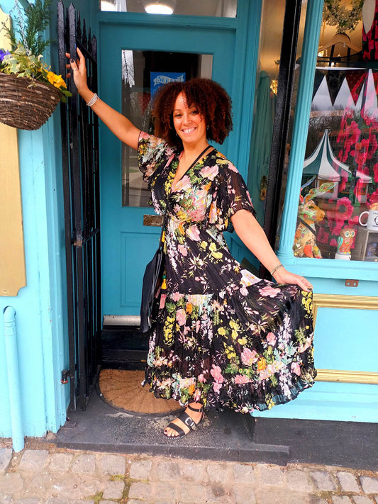 'ELEANOR' FLORAL ANGEL SLEEVE SWISHY HEM MIDI DRESS BLACK SPICE