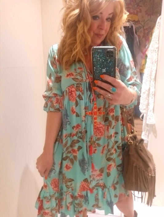 THE 'BELLE ANTICA' STUNNING DUCK EGG AND MULTI BIRD PRINT RUFFLE NECK SMOCK DRESS WITH TASSEL DETAIL