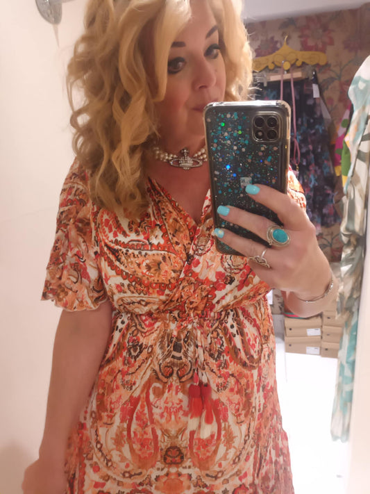 'ELEANOR; STUNNING PLISSE ANGEL SLEEVE MAGIC DRESS WITH SWISHY HEM AND TASSEL DETAIL. CORAL PRINT