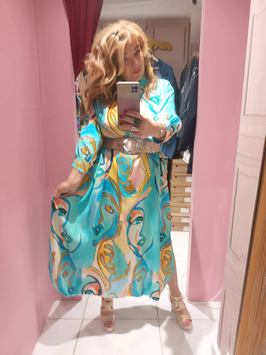 THE 'ARTY ELEGANCE' SOFTLY TAILORED PICASSO PRINT DRESS WITH ELEGANT SHIRT STYLE HEMLINE.