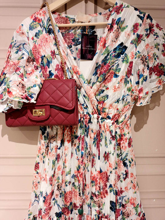'ELEANOR' FLORAL ANGEL SLEEVE SWISHY HEM MIDI DRESS WHITE/RAINBOW COLOURS