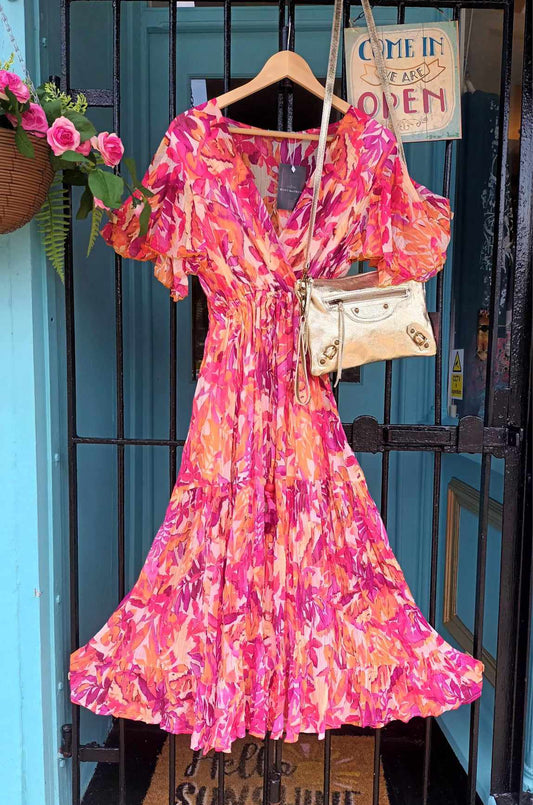 'ELEANOR' RHAPSODY IN PINKS BEAUTIFUL BOTANIC PRINT DRESS WITH SWISHY HEMLINE AND FLUTTER SLEEVES