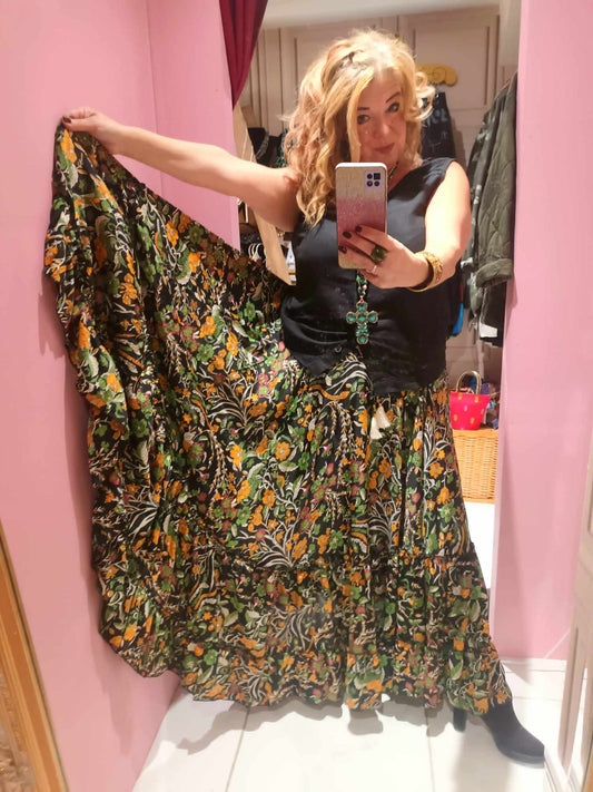 'FIESTA TIME' BREATHTAKING FULL CIRCLE SWISHY MAXI SKIRT IN A BIRDS & BOTANICS PRINT
