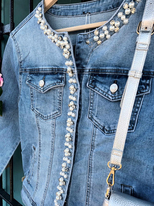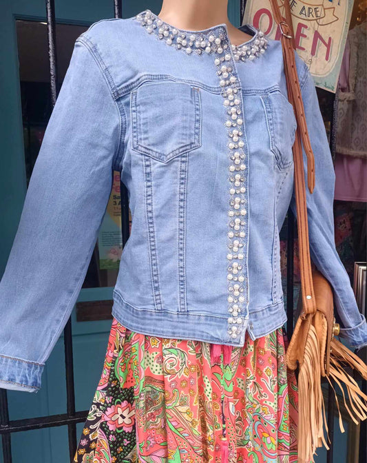 THE 'TAYLOR' FABULOUS PEARL AND DIAMANTE EMBELLISHED SUPERSOFT FADED STRETCH DENIM JACKET