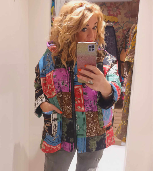 THE 'PANDORA PATCH' BRIGHT AND BEAUTIFUL PATCHWORK PRINT QUILTED HOODED JACKET