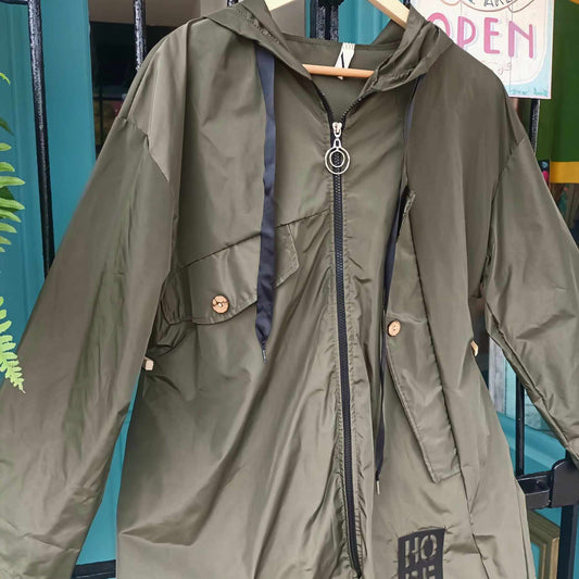 THE 'SUPERNOVA' KHAKI KAGOULE WITH HOPE MOTIF, FEATURE ZIP AND BUTTON DETAIL