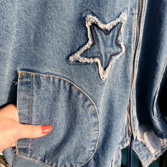 THE 'STARGAZER' APPLIQUE STARS FISHTAIL HEM DENIM JACKET WITH FEATURE POCKETS