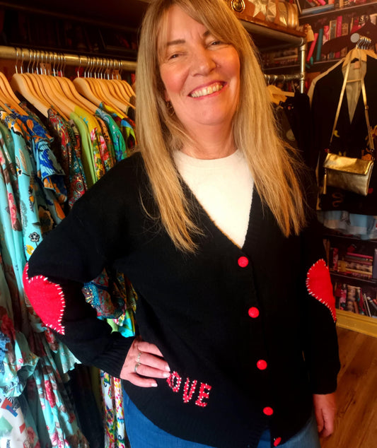 THE 'LOVE IS...' CUTE AND COSY HEART PATCH CARDIGAN WITH BLANKET STITCH DETAIL