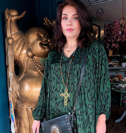 'TALULLAH' HERMOSO VESTIDO CON ESTAMPADO ANIMAL EN COLOR VERDE BOTELLA APAGADO. ESTILO OVERSIZE.