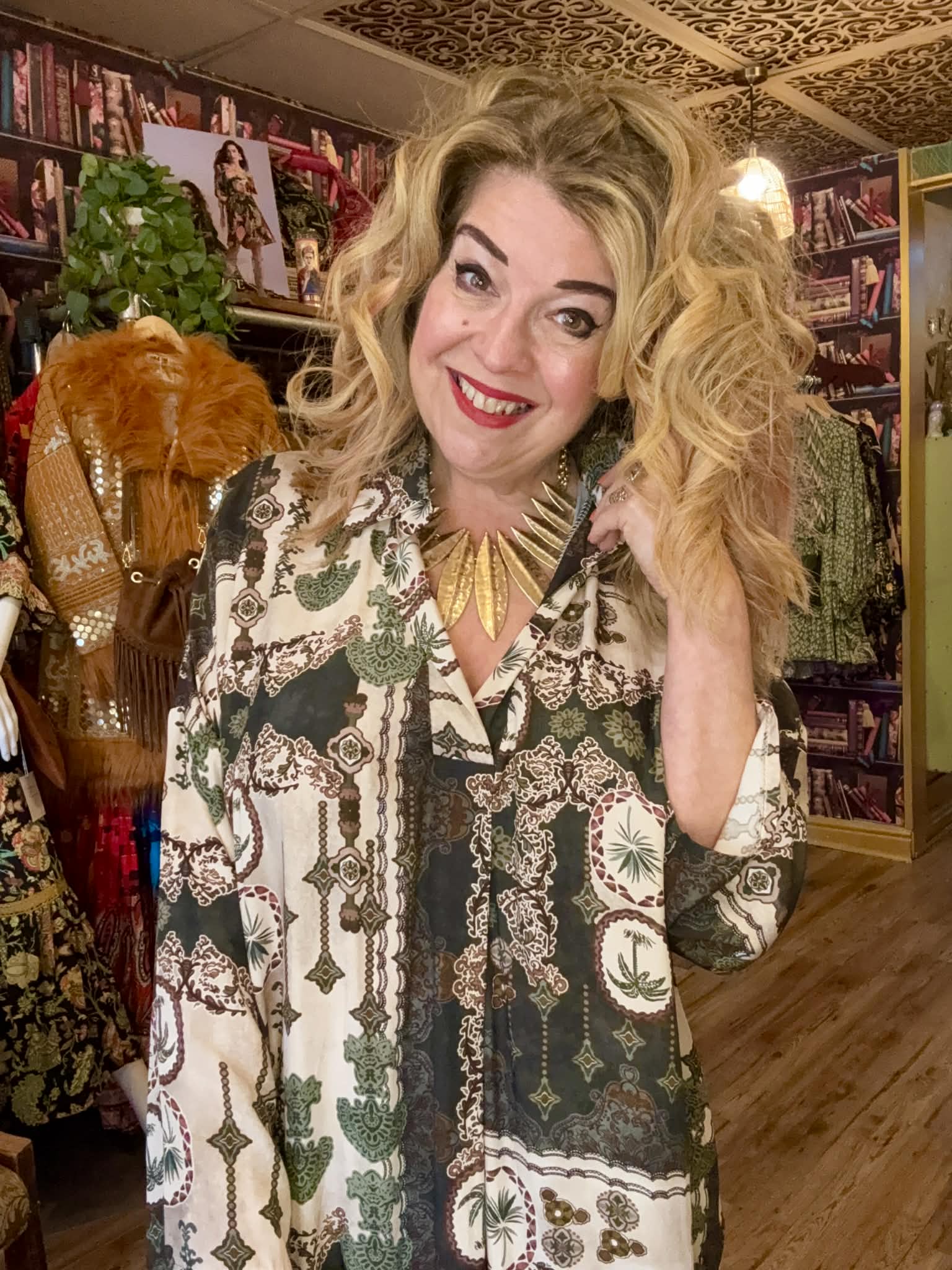 THE 'CASABLANCA' FABULOUSLY FLATTERING ETHNIC INSPIRED PRINT POCKET DETAIL SHIRT DRESS RUBY OR KHAKI