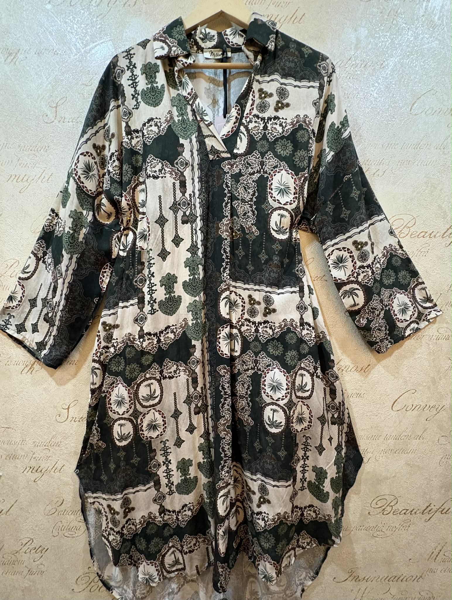 Coming in a fusion of ethnic style Moroccan prints, this stunning dress features a flattering v neckline and shirt style collar. With relaxed pockets to the sides this fabulously flattering dress is tailored to hang beautifully and has a stylish shirt style shaped hemline. Coming to the mid calf (model is 5'4") this easy to wear dress works with cowboy boots or sandals. Layer with a denim jacket on chilly days or have this as your perfect holiday day dress!