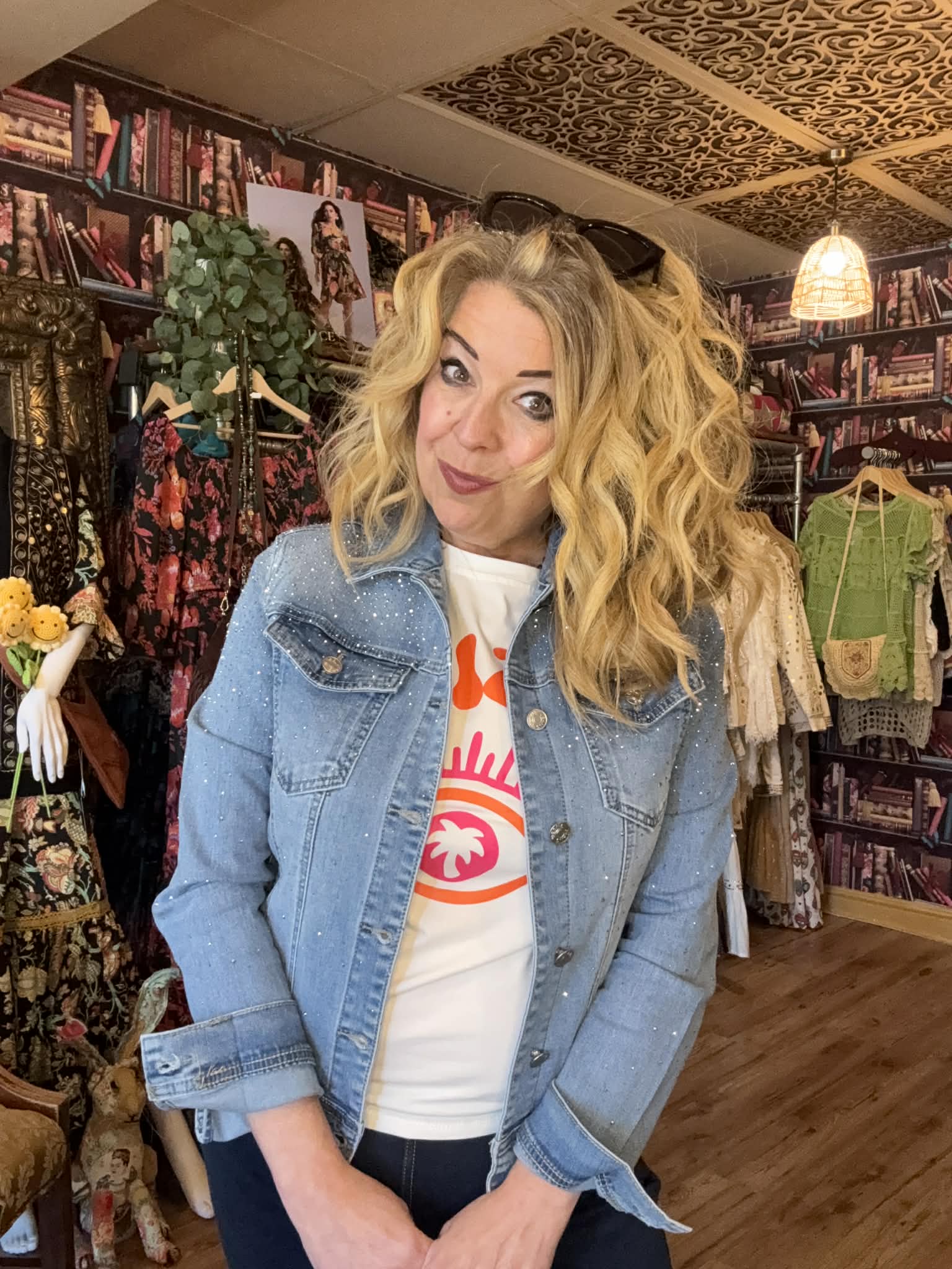 Coming in a classic vintage wash faded denim, this stunning jacket comes in a flattering female fit and features breathtaking rhinestone embellishments to the back and front. Coming in a butter soft denim with a touch of stretch. This jacket elevates the classic denim into a more glamorous style. Perfect for weekend drinks layered over one of our stunning Spanish dresses or with our cocoon pants!