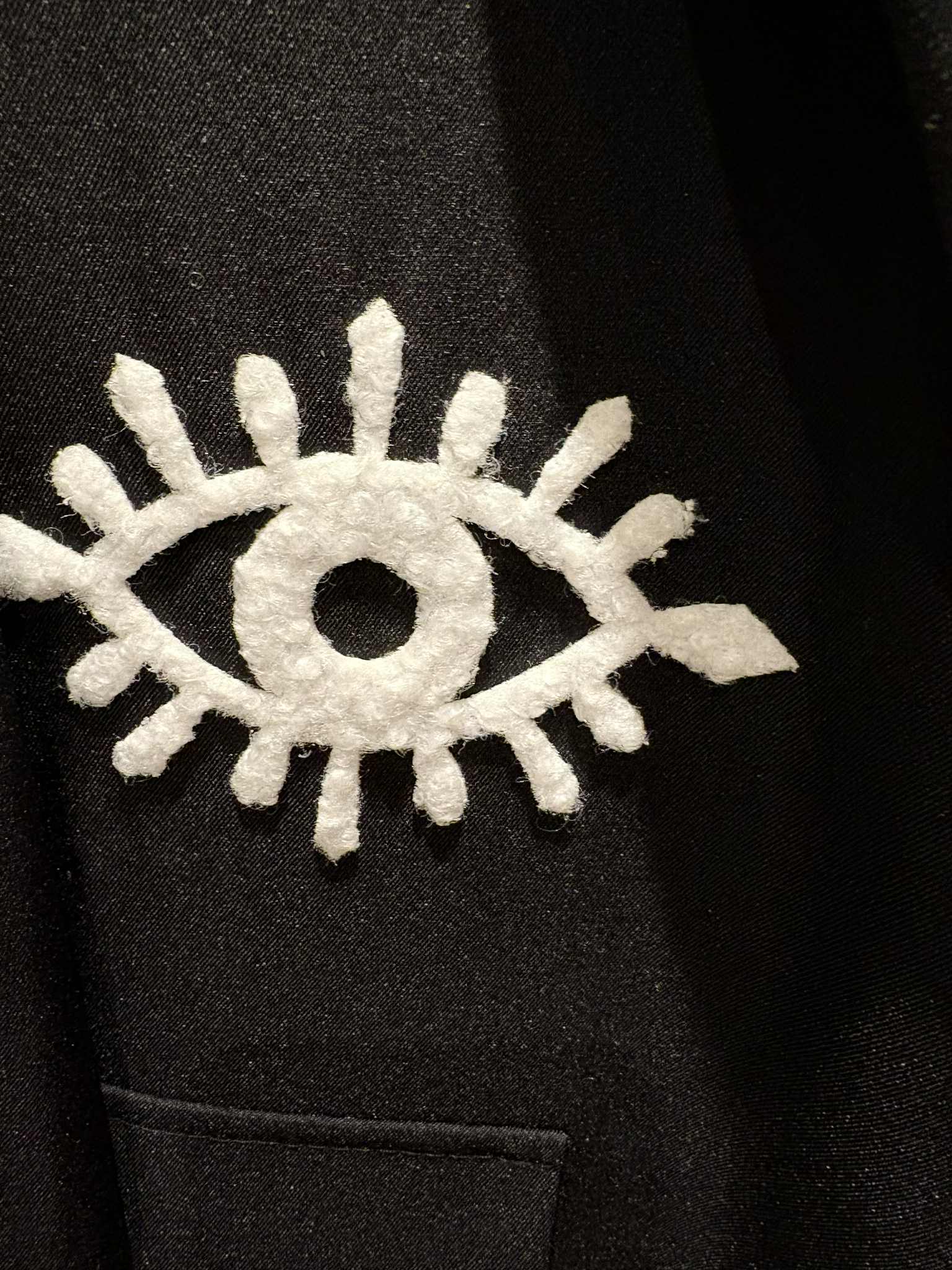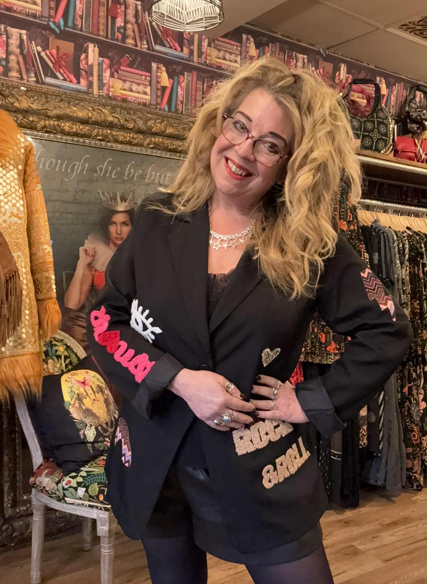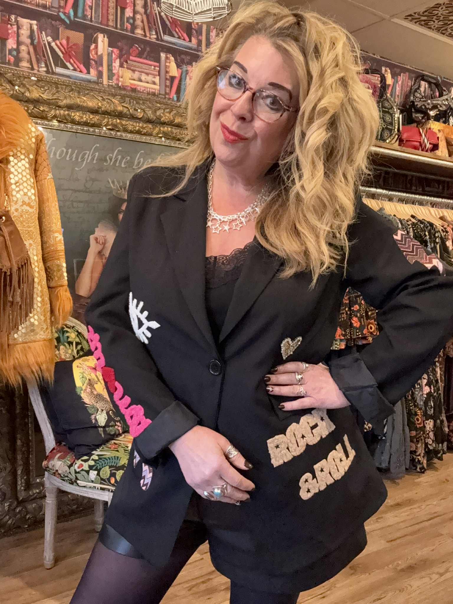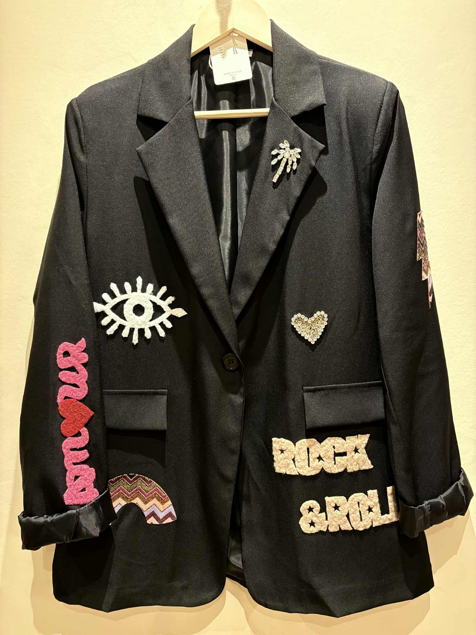 THE 'ROCK AND ROLL' CLASSIC BLACK EMBELLISHED BLAZER FEATURING BOLD ROCK STAR MOTIFS