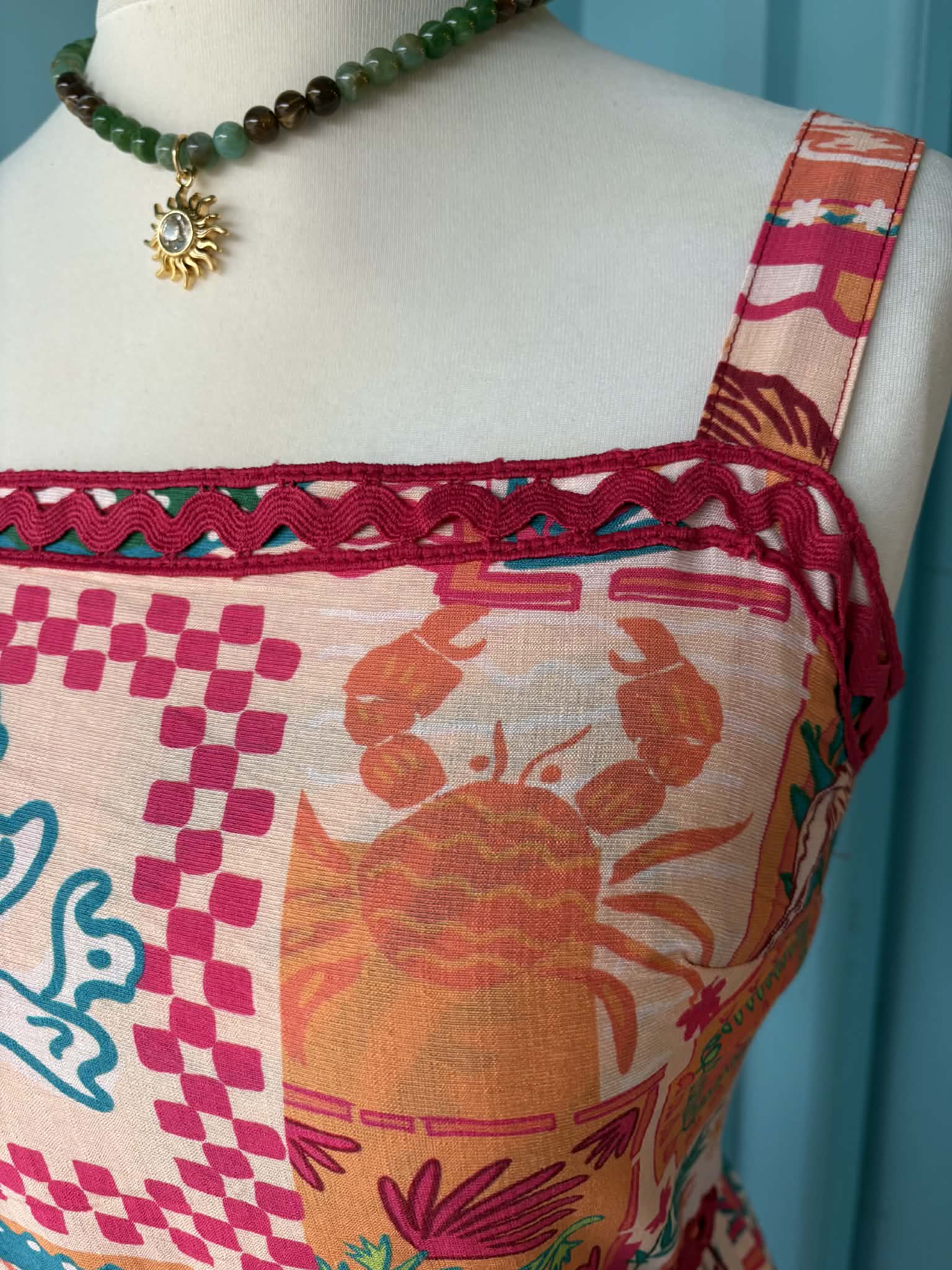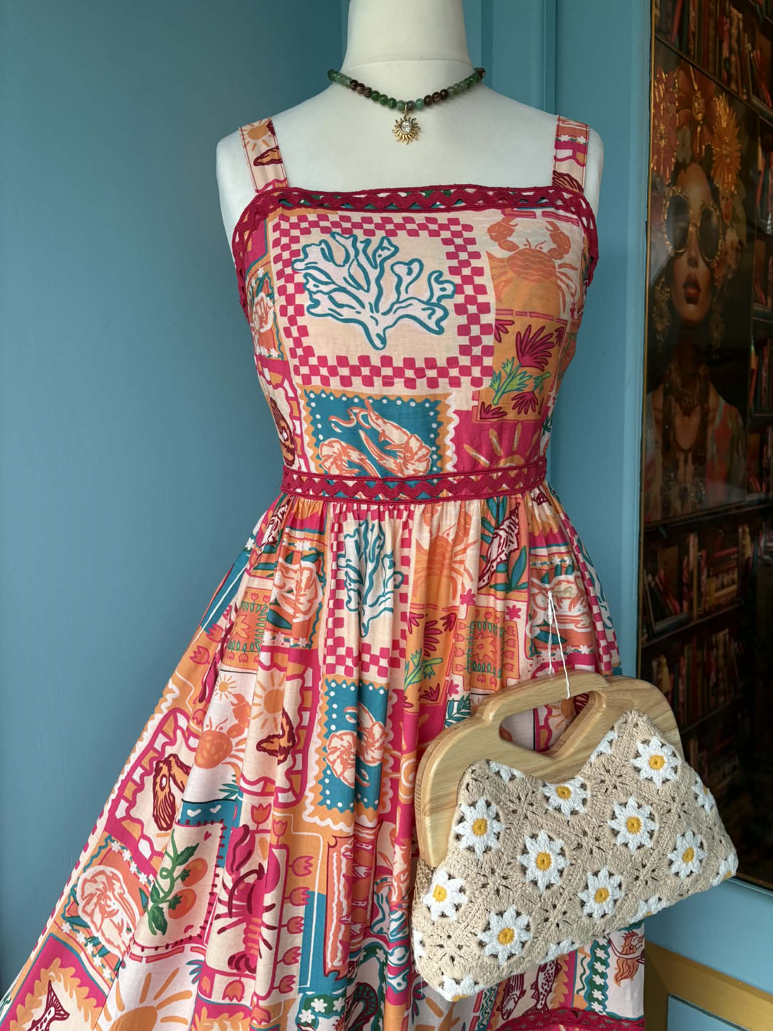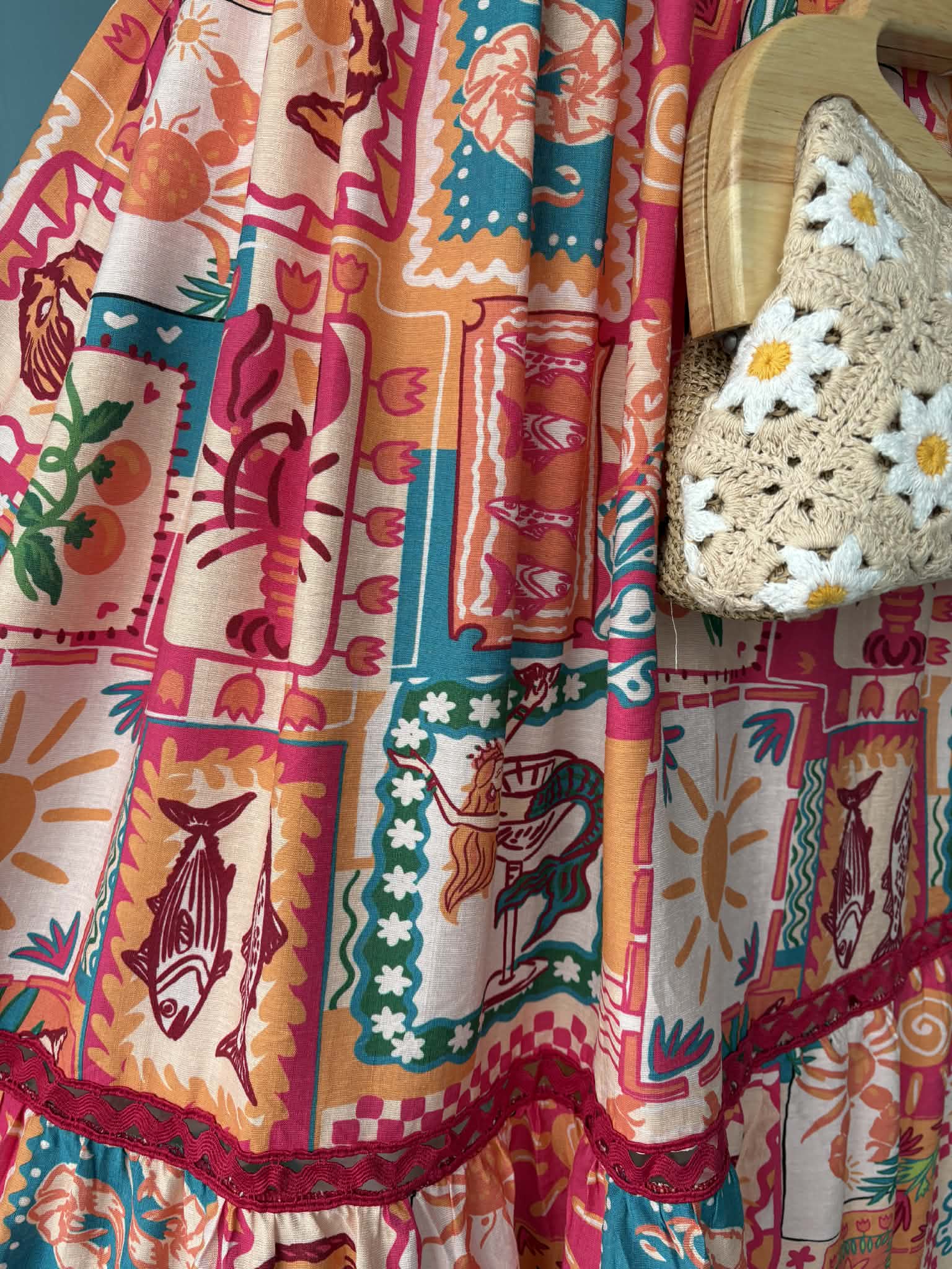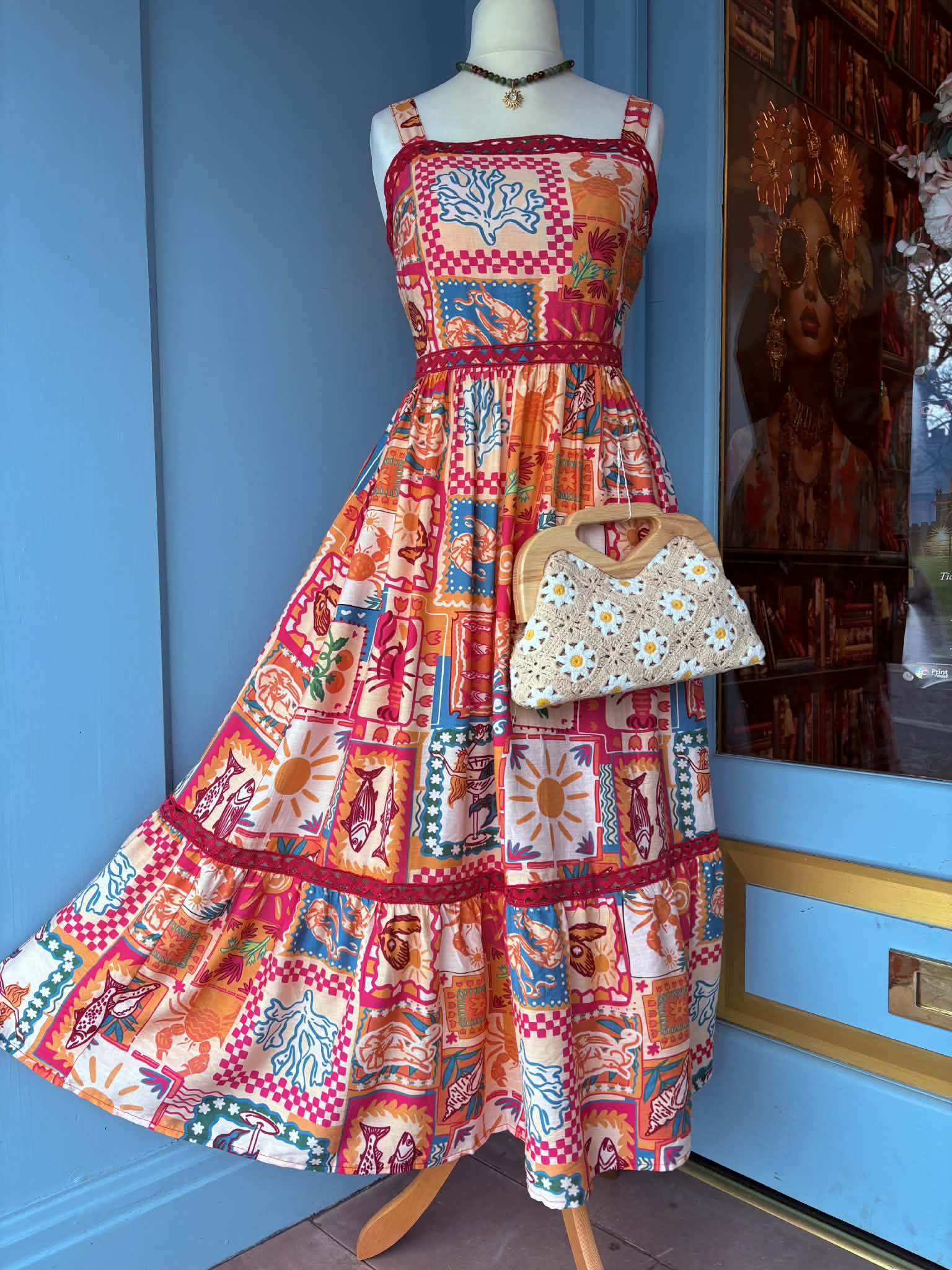 Coming in a bright and beautiful quirky print, featuring suns, seashells, flowers and fishes. This stunning dress has a fabulous vintage 50's style feel, with cute rik rak trim and concealed pockets, this beautiful dress has a shirred elasticated back to give a flattering fit and a full and flippy fifties style midi length skirt!
