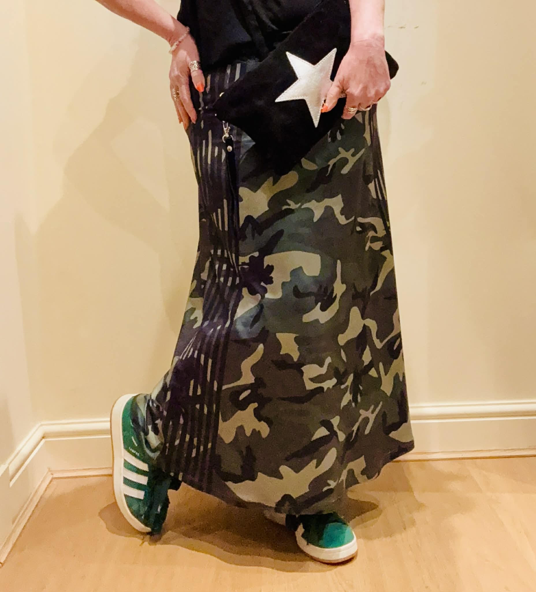 It's giving airport travel vibes! It's giving urban chic with a touch of sportiness! Camouflage is huge this season, and we've captured the trend with this amazing ankle skimming sporty skirt complete with urban street inspired side stripes. With a comfortable stretch waist we can't think of anything cooler to team with a denim jacket, one of our ROCK STAR FEMALE FIT TEE'S and a denim jacket.
