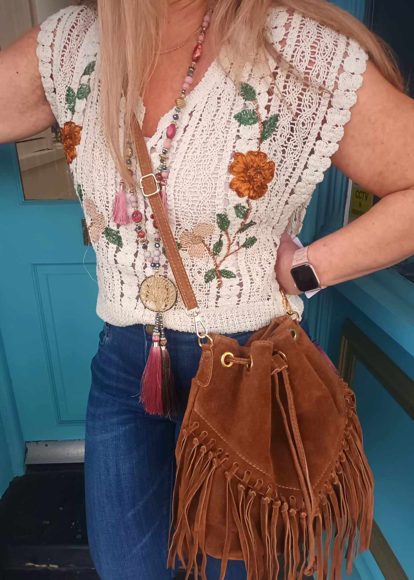 Coming in 100% luxurious Italian suede leather this beautiful and boho style bag is perfect for holidays and festival season! With an adjustable strap with the option to wear on the hip or as a shorter length this 70's style bag has eyelet and drawstring fastening, oodles of funky fringe and an inner zip.