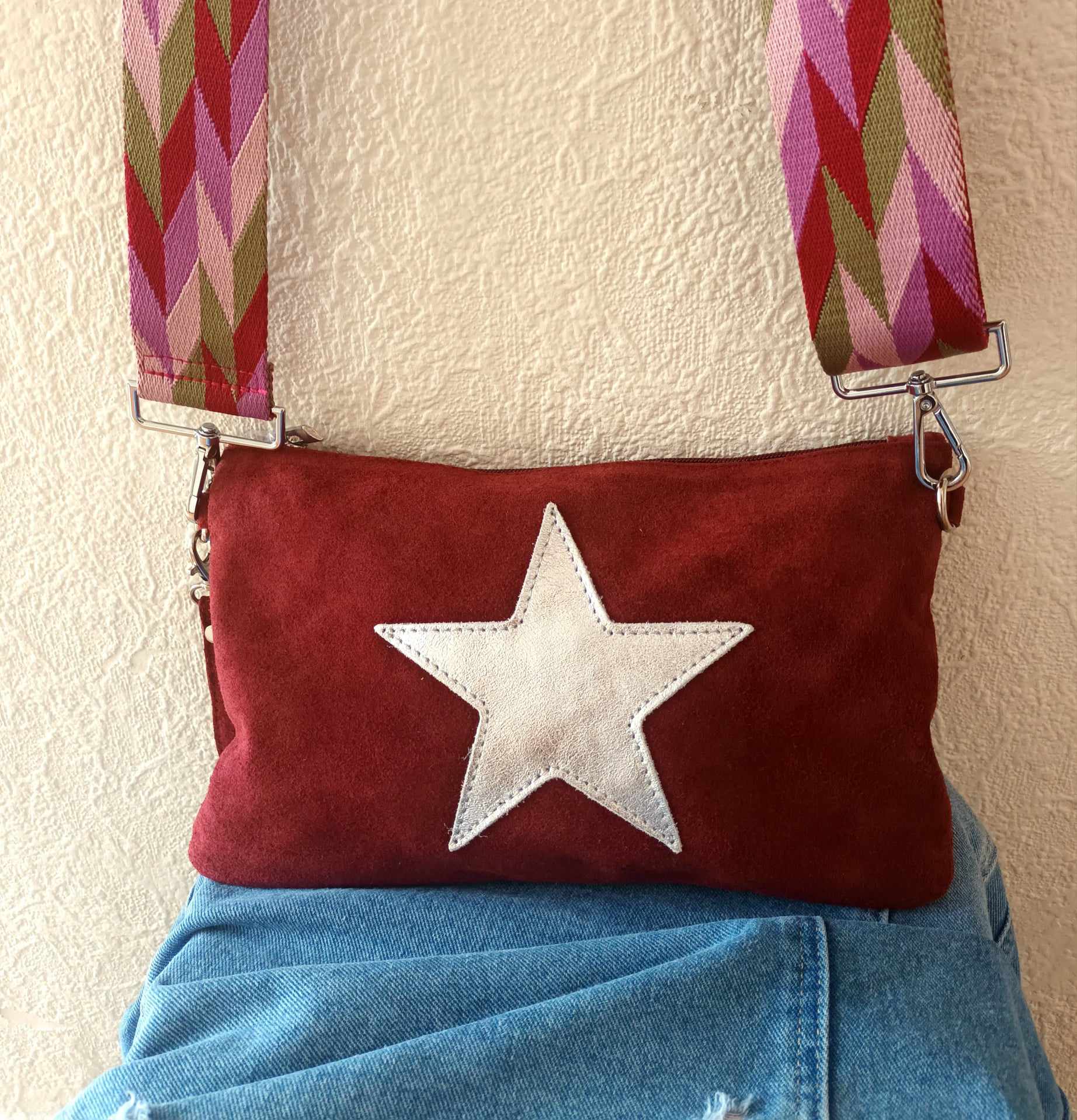 Coming in 100% Italian leather, this supersoft suede bag features a sassy silver star motif to one side and zip pocket to the other. With a detachable fancy star strap, this glorious bag also comes with a plain strap or could be used as a wrist bag.