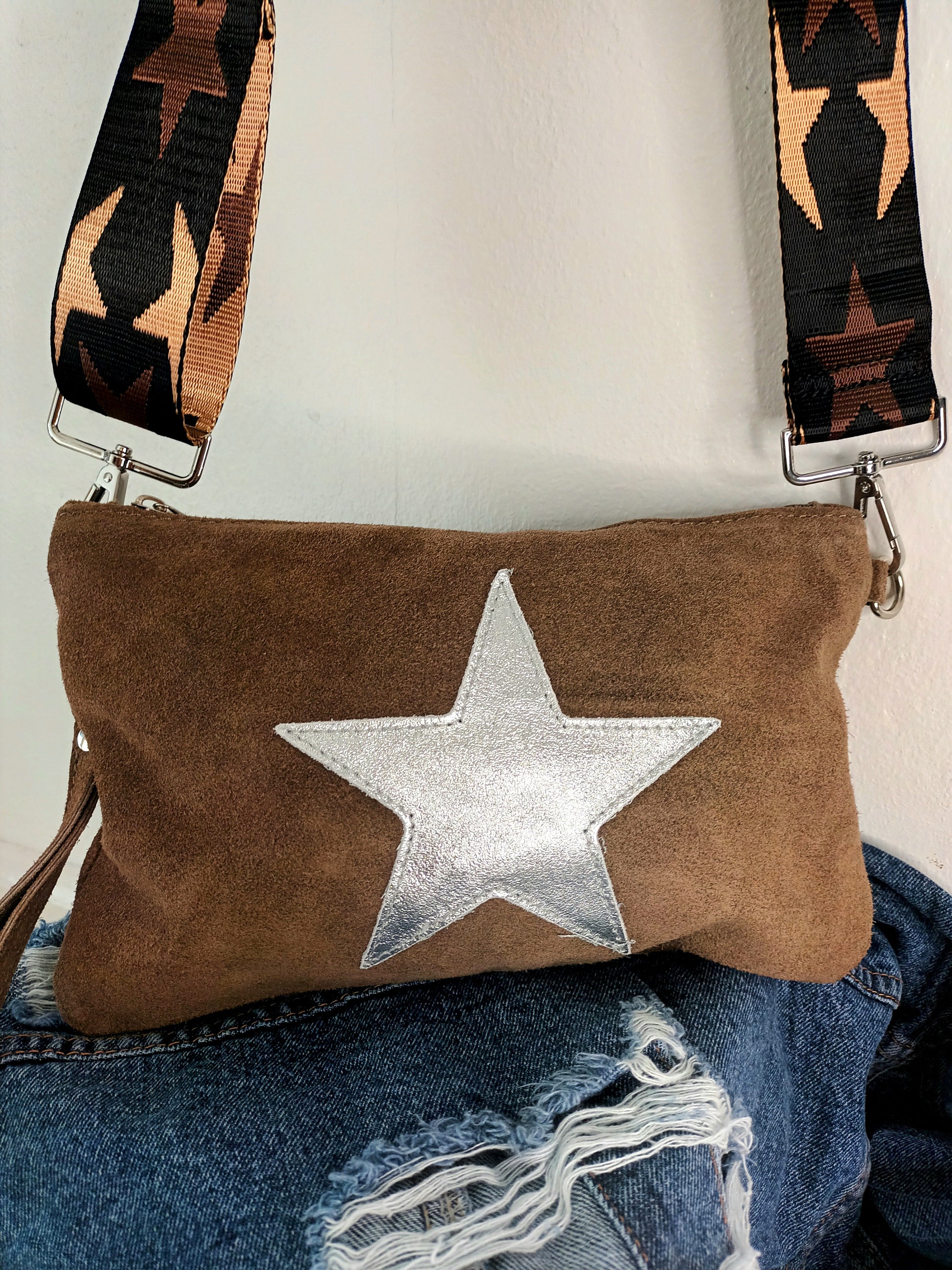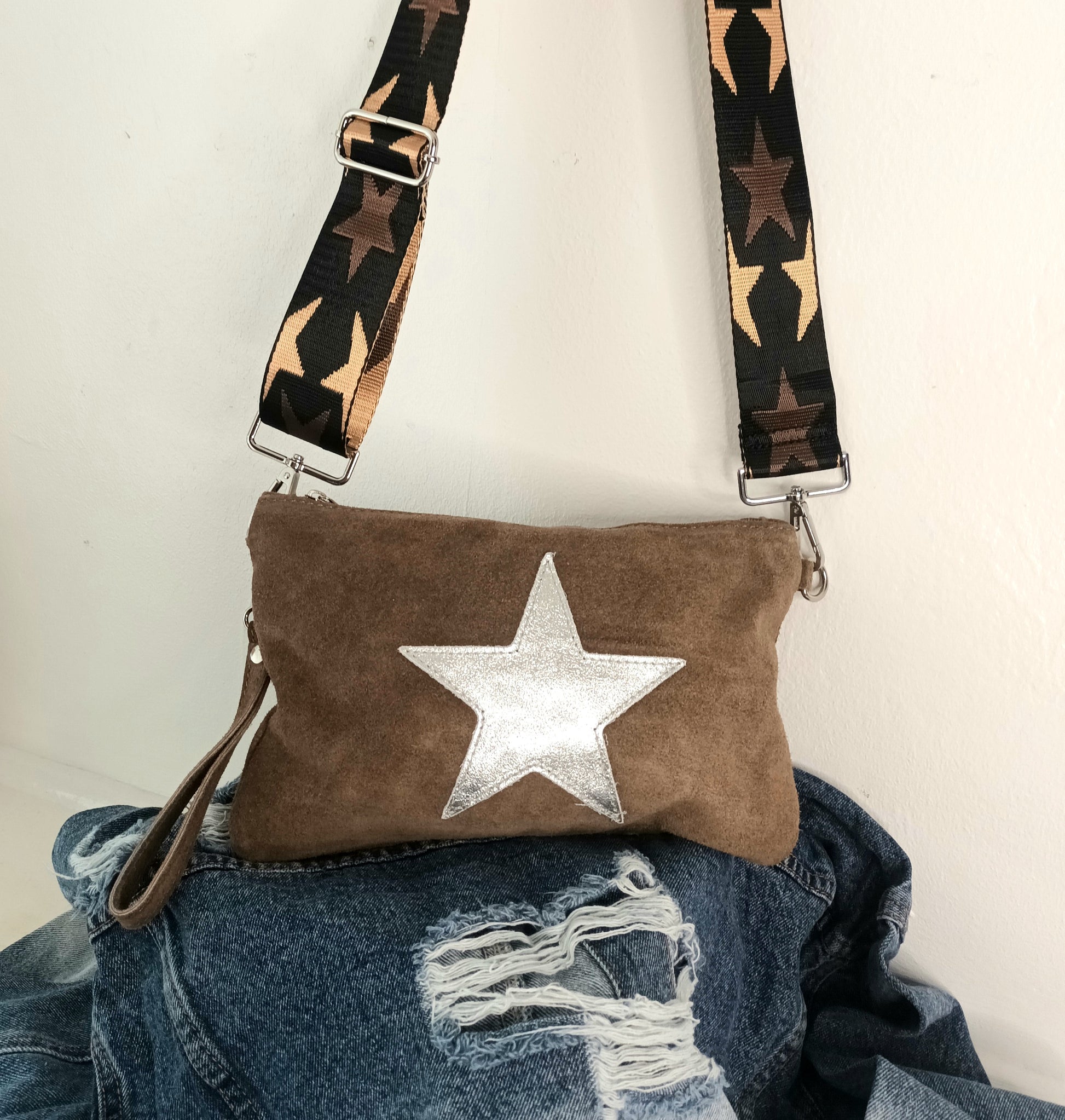 Coming in 100% Italian leather, this supersoft suede bag features a sassy silver star motif to one side and zip pocket to the other. With a detachable fancy star strap, this glorious bag also comes with a plain strap or could be used as a wrist bag.