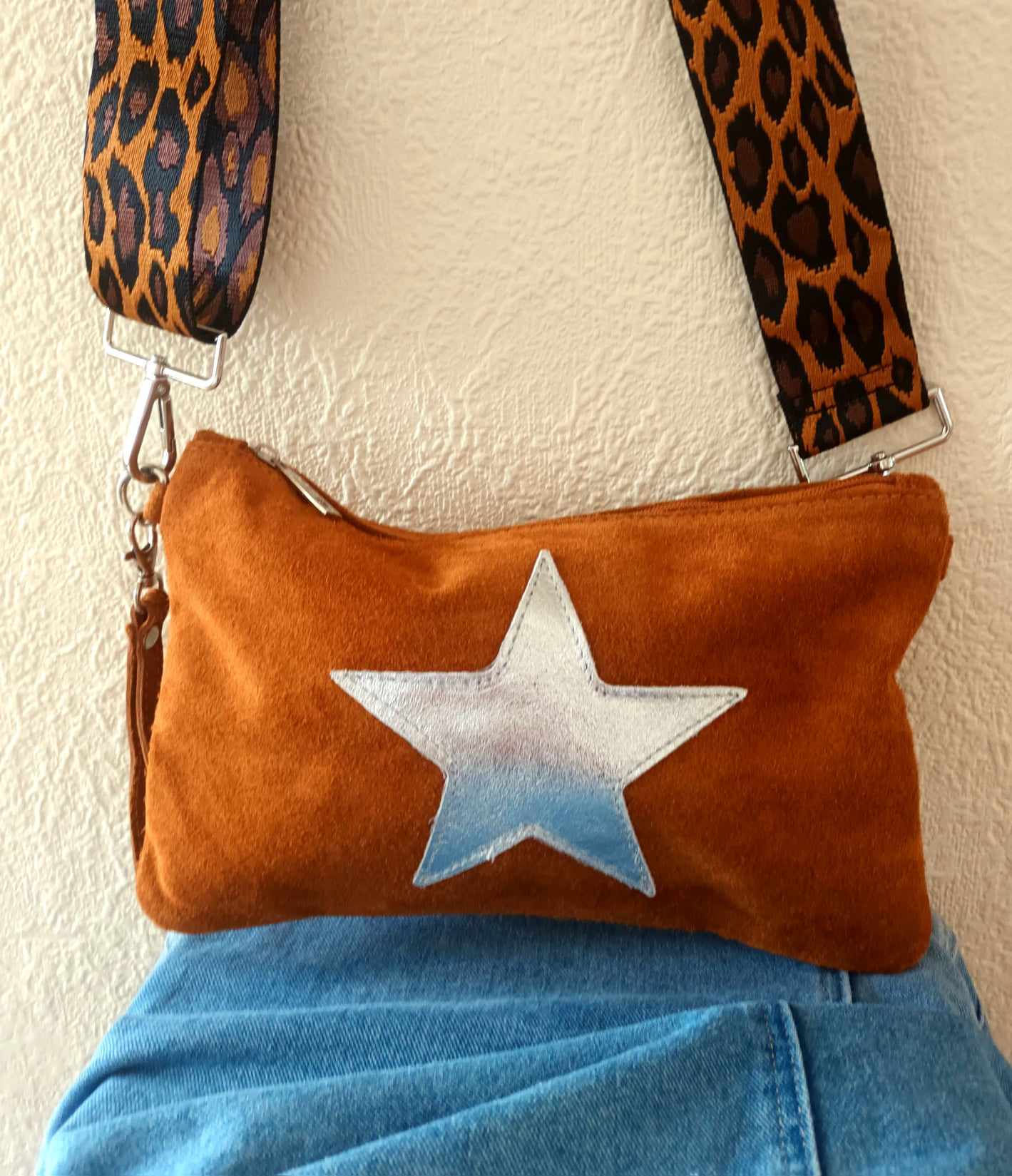 Coming in 100% Italian leather, this supersoft suede bag features a sassy silver star motif to one side and zip pocket to the other. With a detachable fancy star strap, this glorious bag also comes with a plain strap or could be used as a wrist bag.