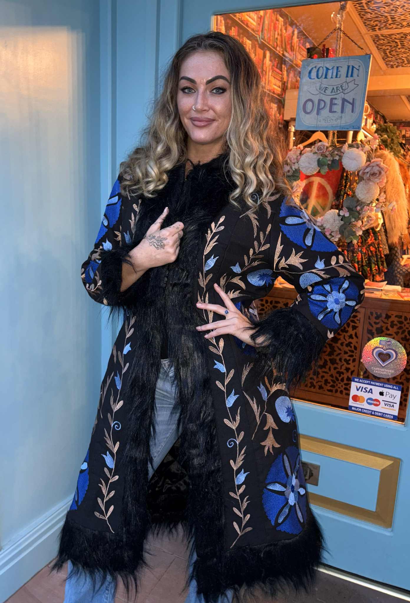 Coming in an iconic seventies afghan style, this glorious coat features a faux fur edge to edge panel and masses of breathtaking cornflower blue and beige floral embroidery to the front and back. With cosy, fluffy faux fur cuffs, this beautiful coat is guaranteed to turn heads! Channel your inner rock chick, and team with flared jeans and chunky boots for the ultimate in 70's style bohemian chic!