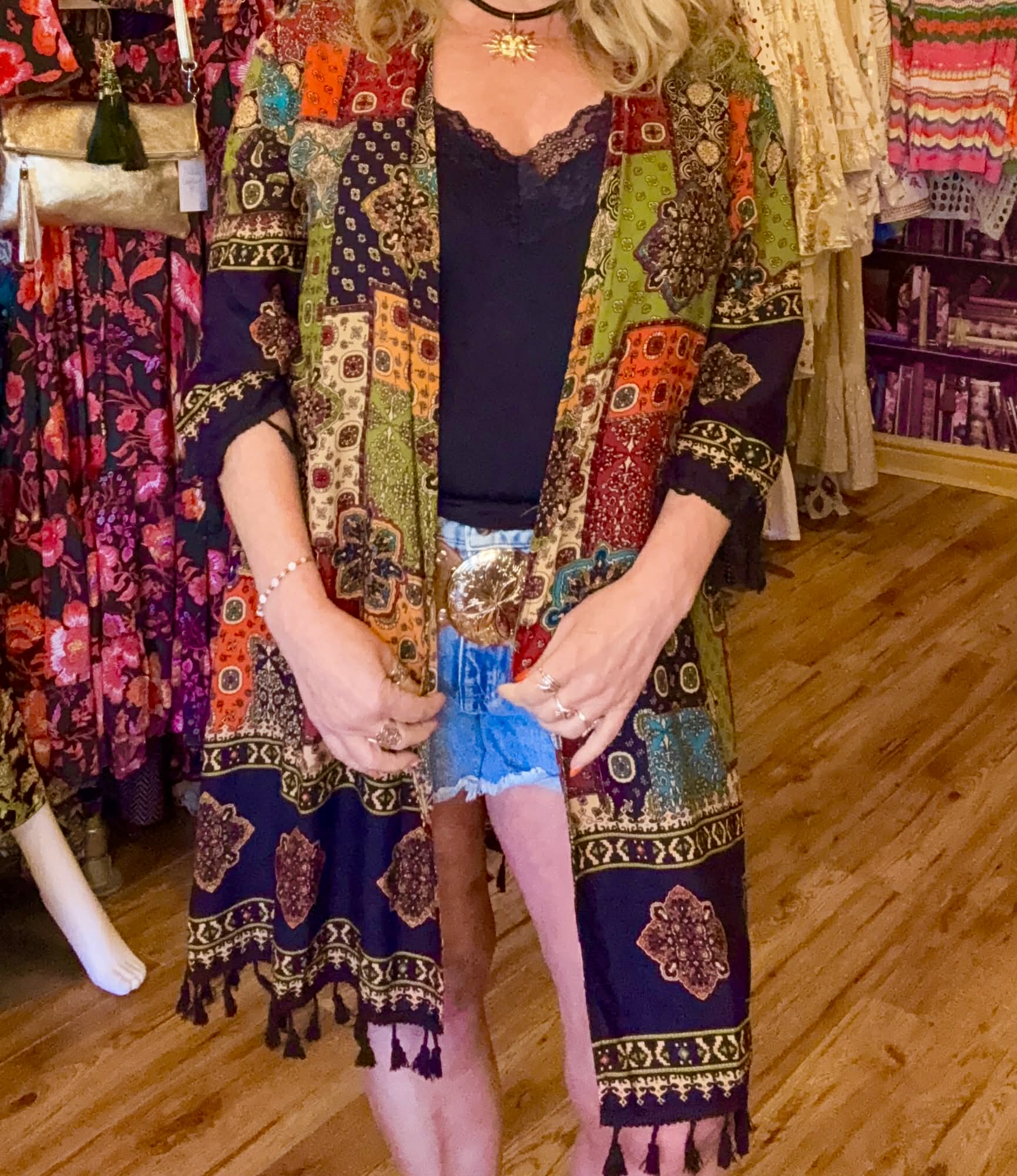 Whichever way you wear this timeless kaftan jacket, the boho styling complete with tassel fringe detail is guaranteed to keep your summer wardrobe on trend this season!