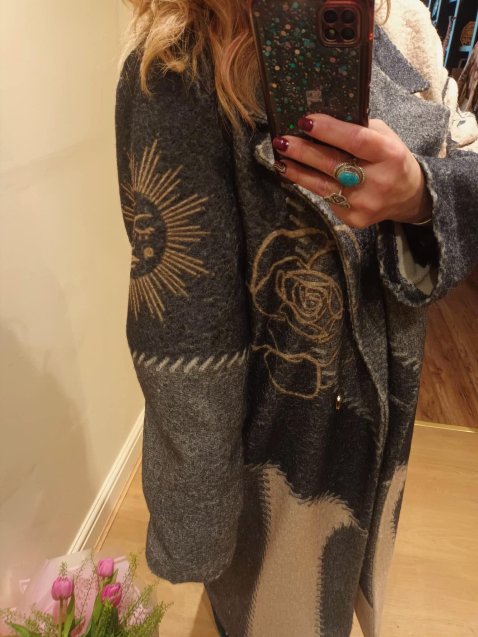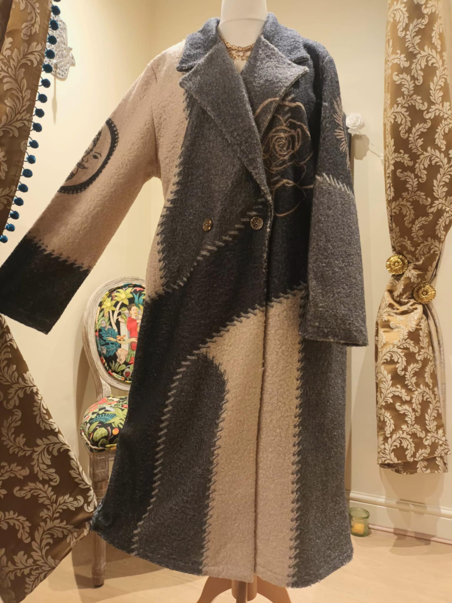 Make a statement in our beautiful spiritual inspired coat, Coming in a beautiful boucle style fabric, this gorgeous blanket coat features a stunning patchwork of muted tones and pretty blanket stitch detailing.