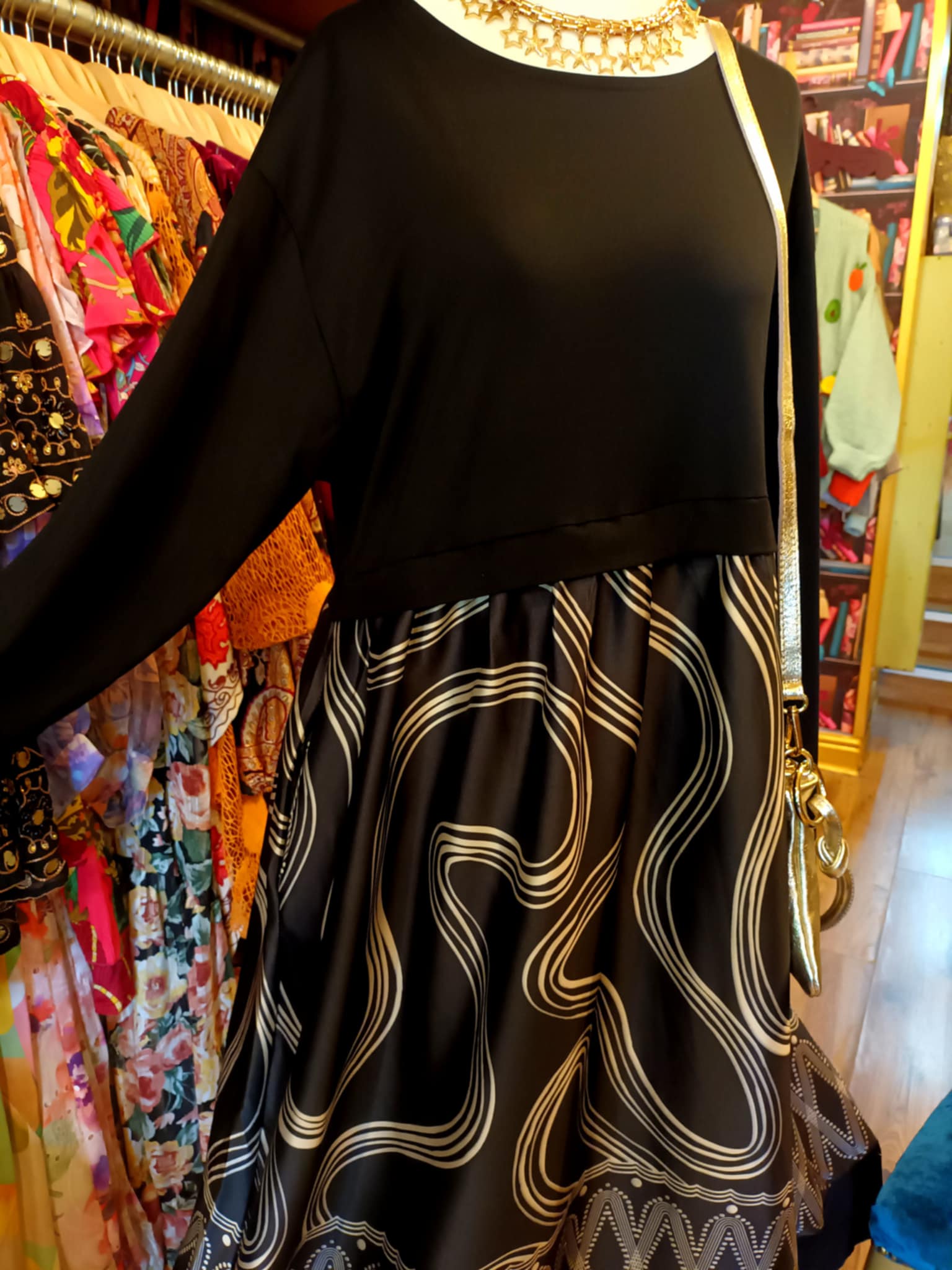Coming in classic black with a beautiful quality stretch jersey scooped neck top and long sleeves, this stunning dress has an exquisite heavy satin cocoon style skirt which features a divine art deco style design. With pretty pockets, this dress could be dressed up or down! Wear with knee high black heeled boots and our HARLEY biker jacket for a divine dressy look. Or, team with trainers and a denim jacket....the possibilities are endless!
