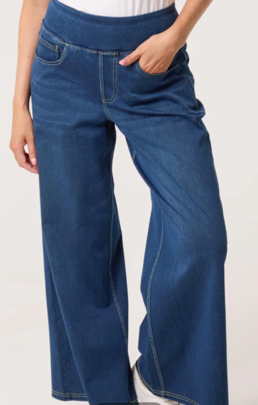 We think we have found the most flattering, comfortable jeans ever! Our HALLE jeans come in a classic denim blue. Coming in this seasons bang on trend wide legged, flared style. These jeans have all the trademarks of a pair of jeans but pull on (almost like leggings) and feature stitch detail and a tummy fixing high rise and wide waistband.