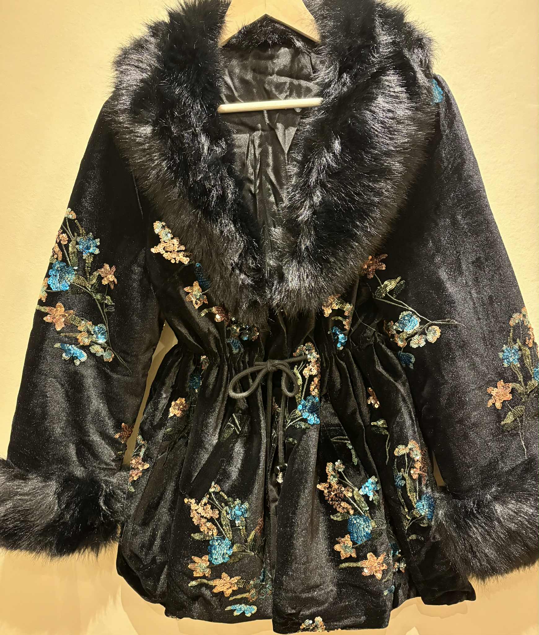 Coming in a luxurious glossy velvet and with a cosy faux fur collar and cuffs. This divine coat features masses of stunning embroidered and sequinned embellishments to the front and back.