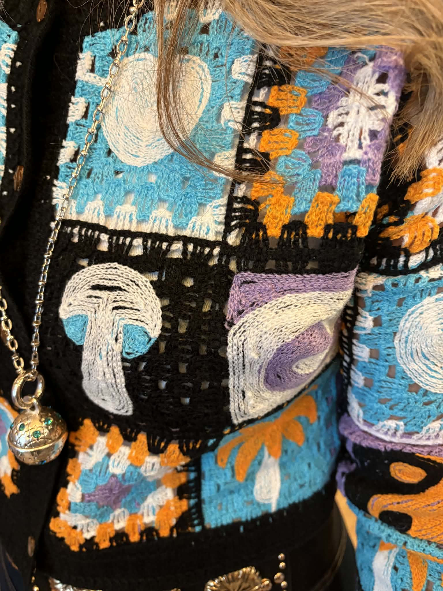 THE 'MYSTIC VIBES' BRIGHT & QUIRKY CROCHET CARDIGAN YING & YANG, HEARTS & MUSHROOMS