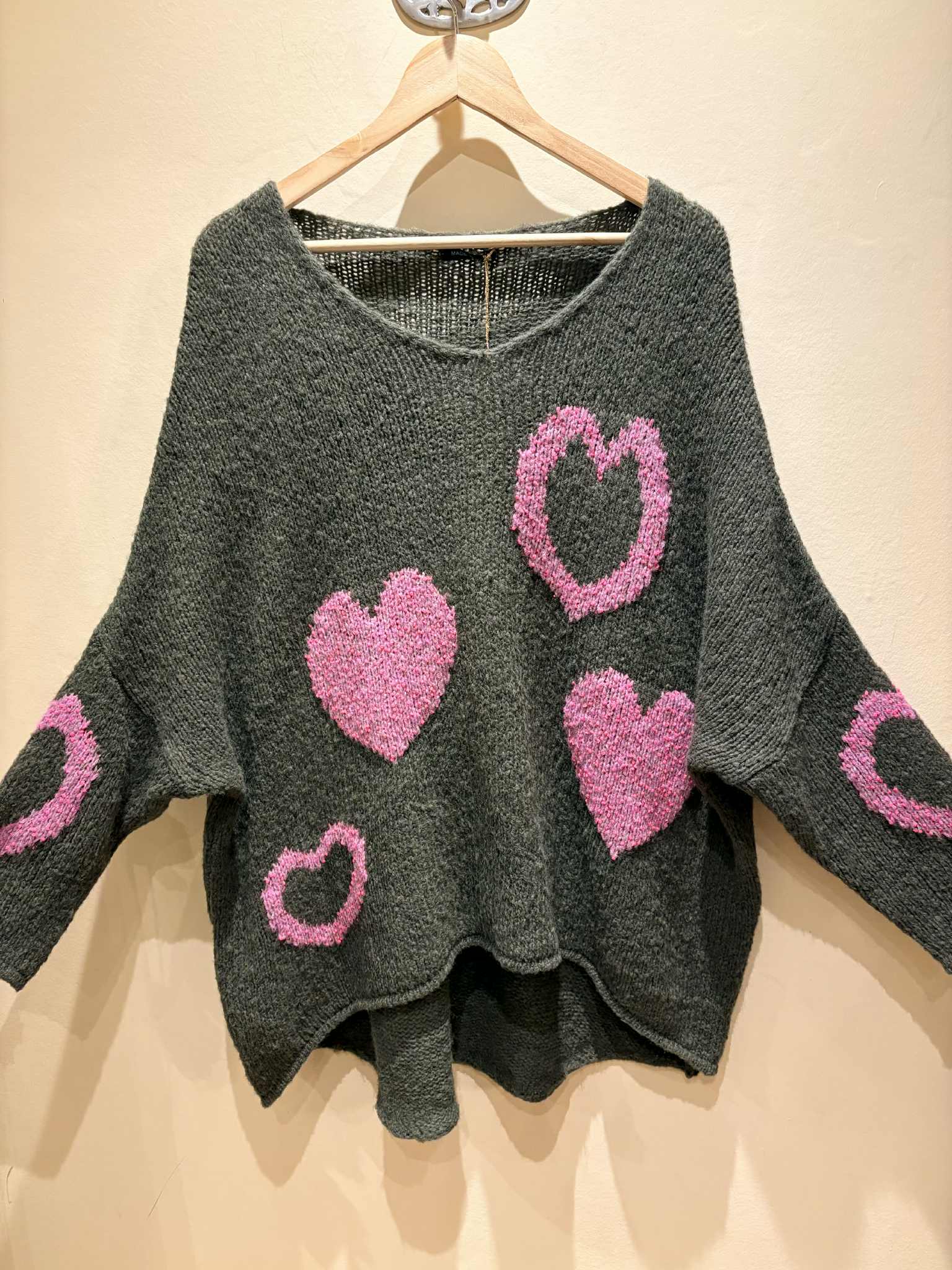 Coming in an elegant khaki or cream, this adorably cosy knit features a hotchpotch of contrasting hearts! With a soft v neckline and dropped sleeves, this pretty jumper dips slightly to the back giving fab bottom coverage!