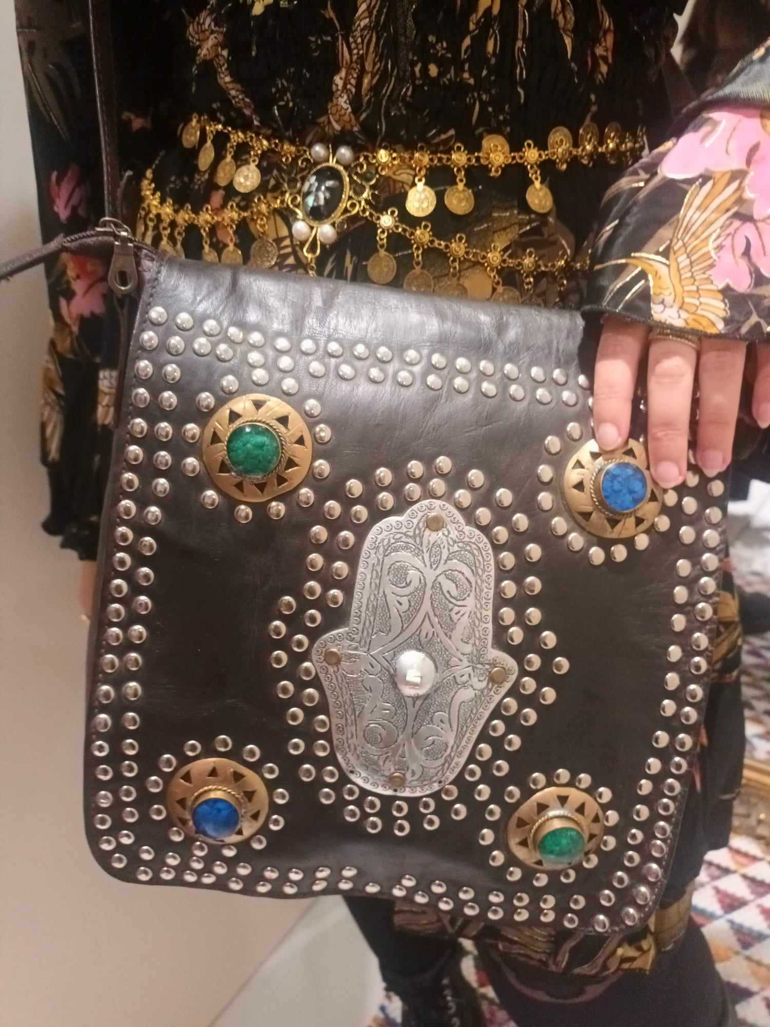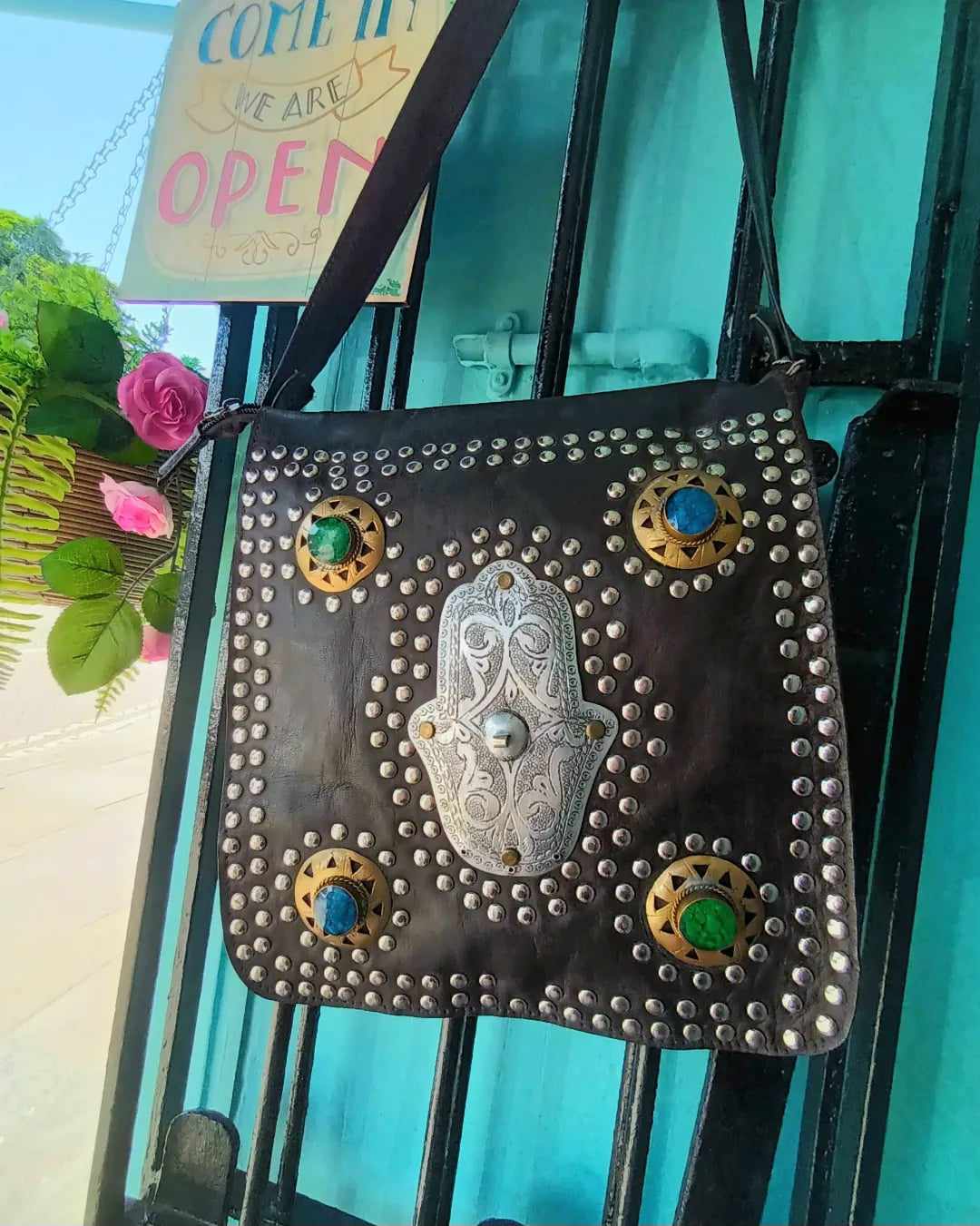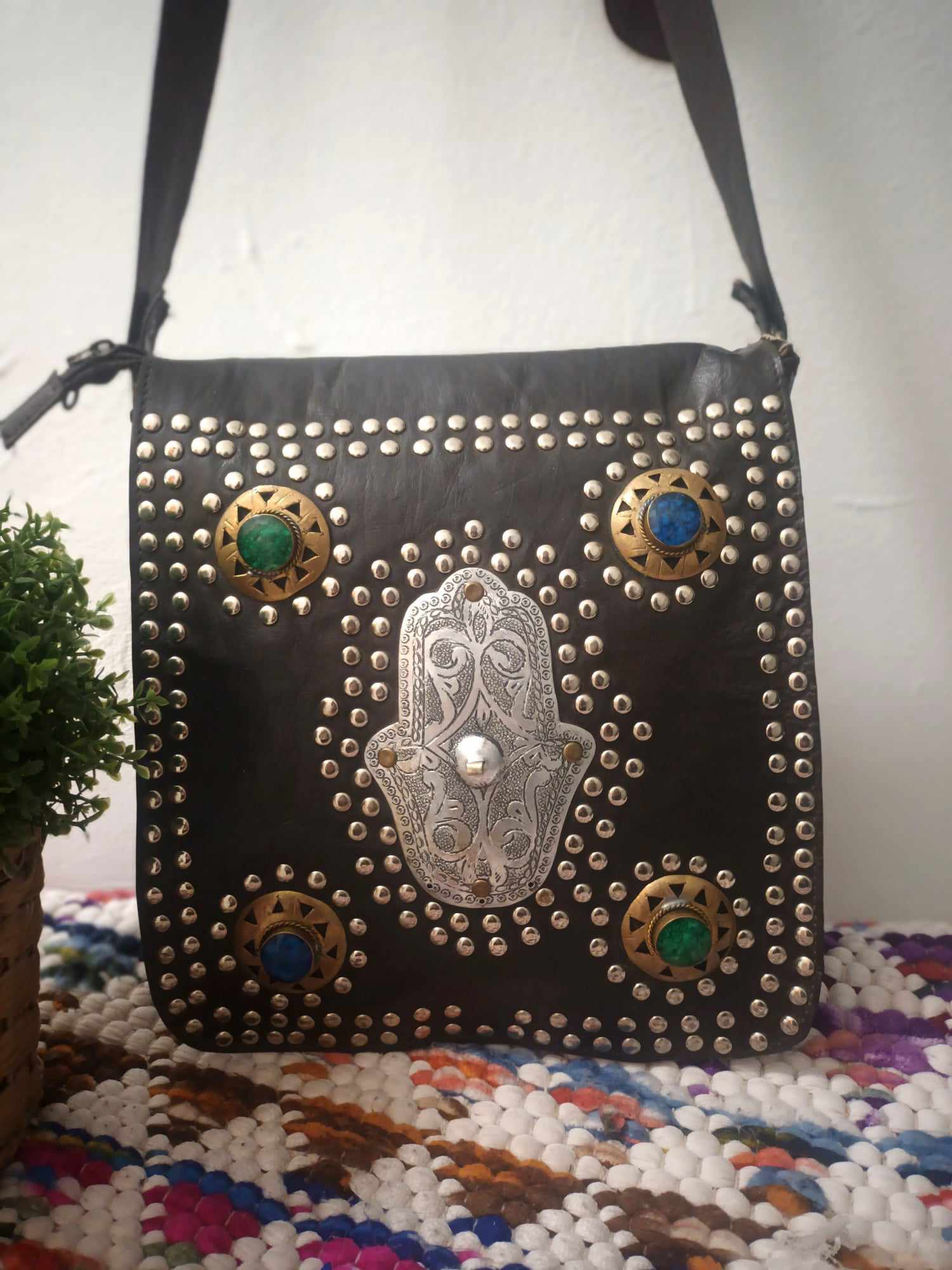 'YASMINE' EXCLUSIVE 100% LEATHER HANDMADE CROSSBODY BAG WITH DECORATIVE HAMZA HAND, STONES AND STUDS